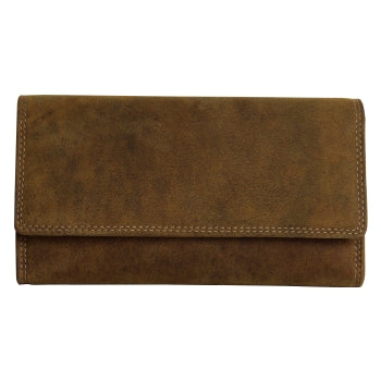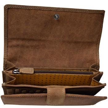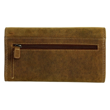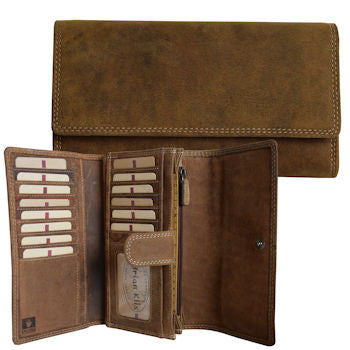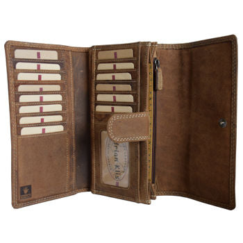 This tri-fold clutch wallet features 2 bill pockets, 14 card slots, 5 side pockets, an ID window, and both an interior zip pocket and exterior zip pocket.