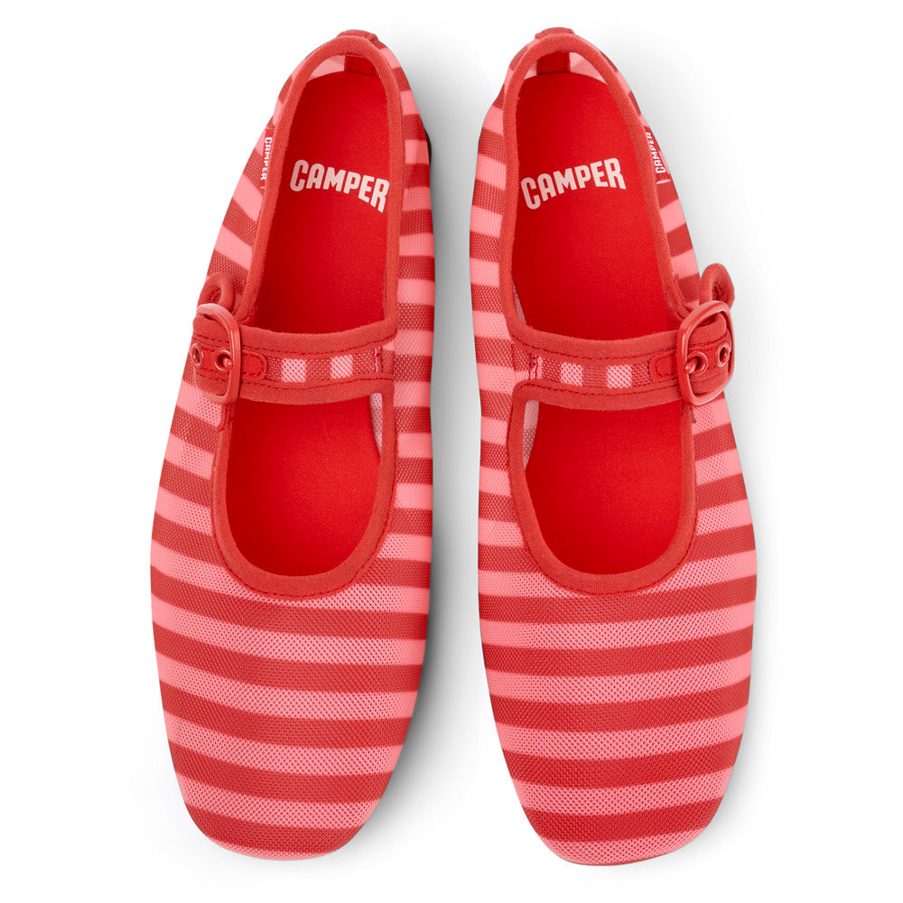 Red and pink textile ballerinas for women with TPU outsoles (20% recycled).
