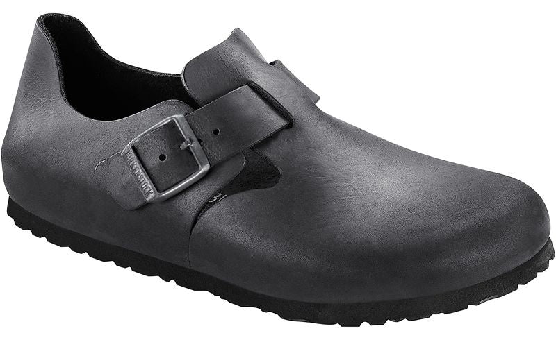 Made in Germany, the Birkenstock London is a variation on the classic Boston clog. The raised heel section is characteristic of this simple low shoe with no stitching. It boasts a natural, rustic look and an open-selvage, unlined finish. This shoe features the classic anatomically shaped suede-lined cork-latex footbed, a durable EVA rubber sole, and an adjustable metal pin buckle. The attention to comfort is evident from the anatomically shaped cork-latex footbed to the oiled leather upper, which hugs the foot like a second skin.