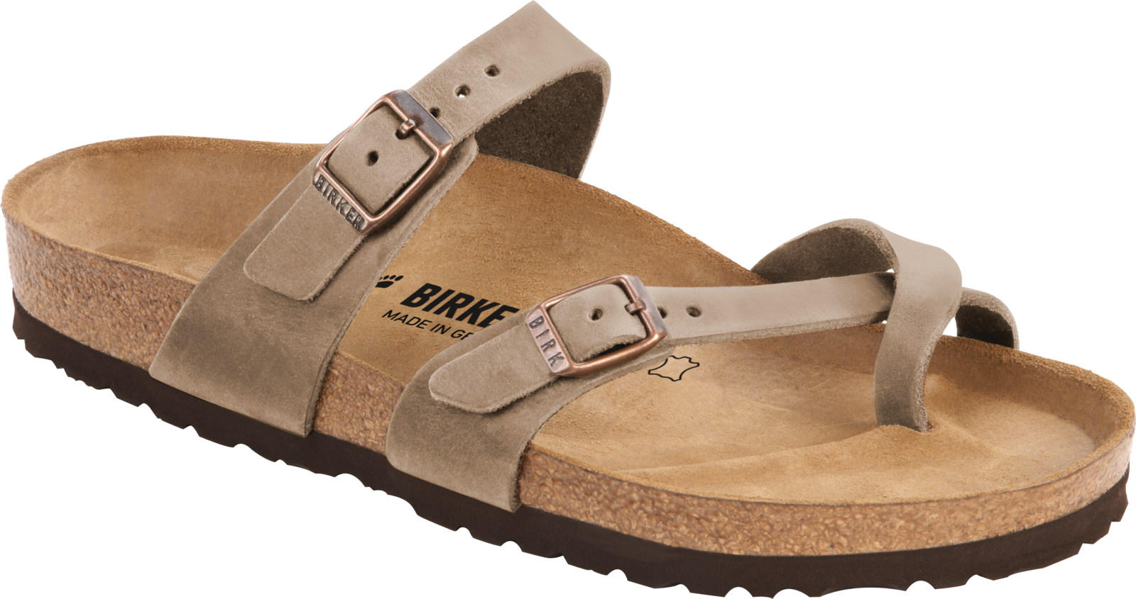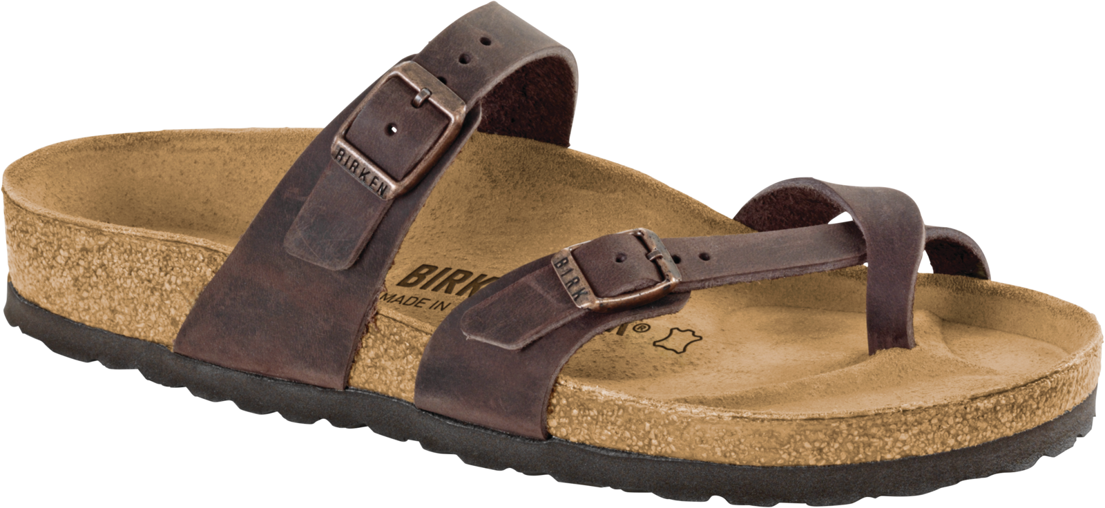 The Birkenstock Mayari thong sandal is a modern model with two individually adjustable straps and a toe loop. The impressive combination of design and wear-ability will see fashion-conscious men and women through the day with elegance and comfort. The upper is made from thick, oiled nubuck leather with an open-selvage finish. This sandal features the traditional suede-lined anatomically shaped cork-latex footbed and a lightweight EVA sole.